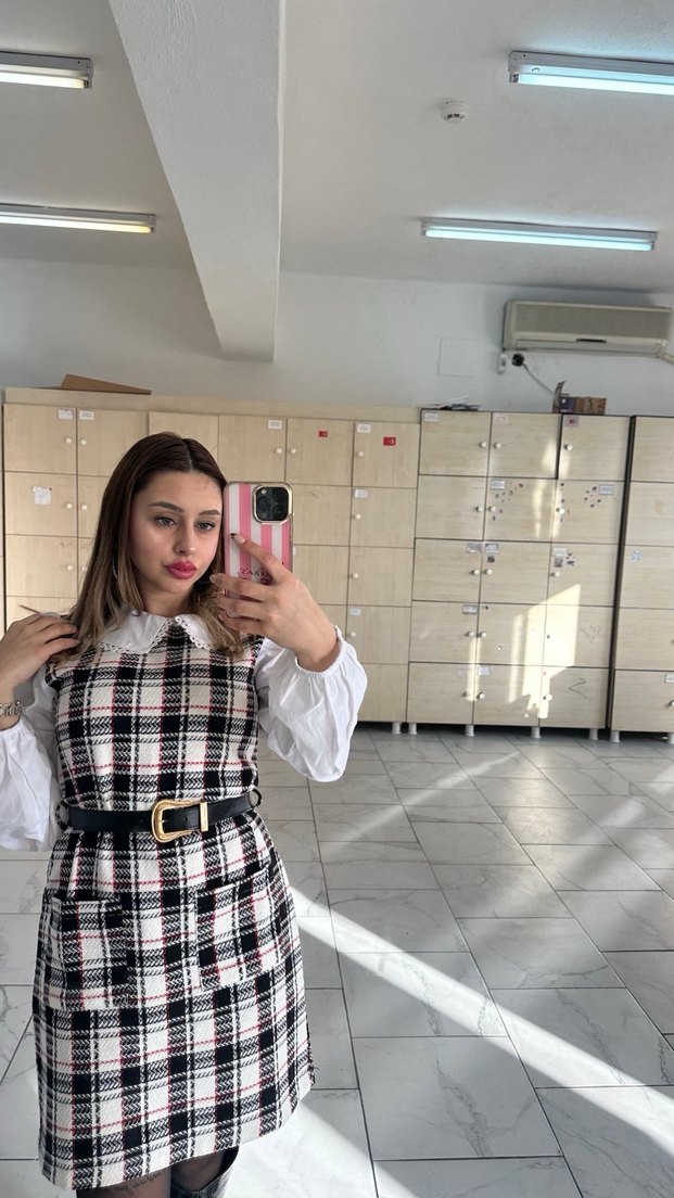 Pembe kareli midi elbise, uzun kollu ve halter yakalıdır. Tokalı kemer ve yumuşak sentetik kumaştan yapılmıştır, günlük kullanım için uygundur.