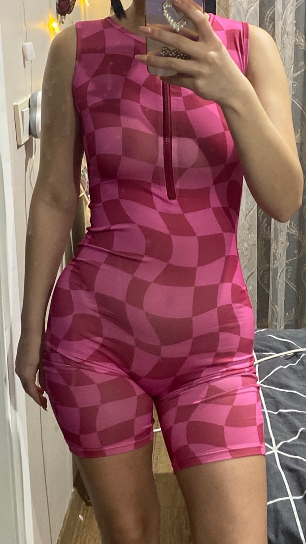 Pembe kareli, şeffaf detaylı, V yaka ve kolsuz tasarıma sahip, dar kesim kısa tulum. Sentetik kumaştan, ön fermuarlı, iddialı sokak stili için uygun. ✨