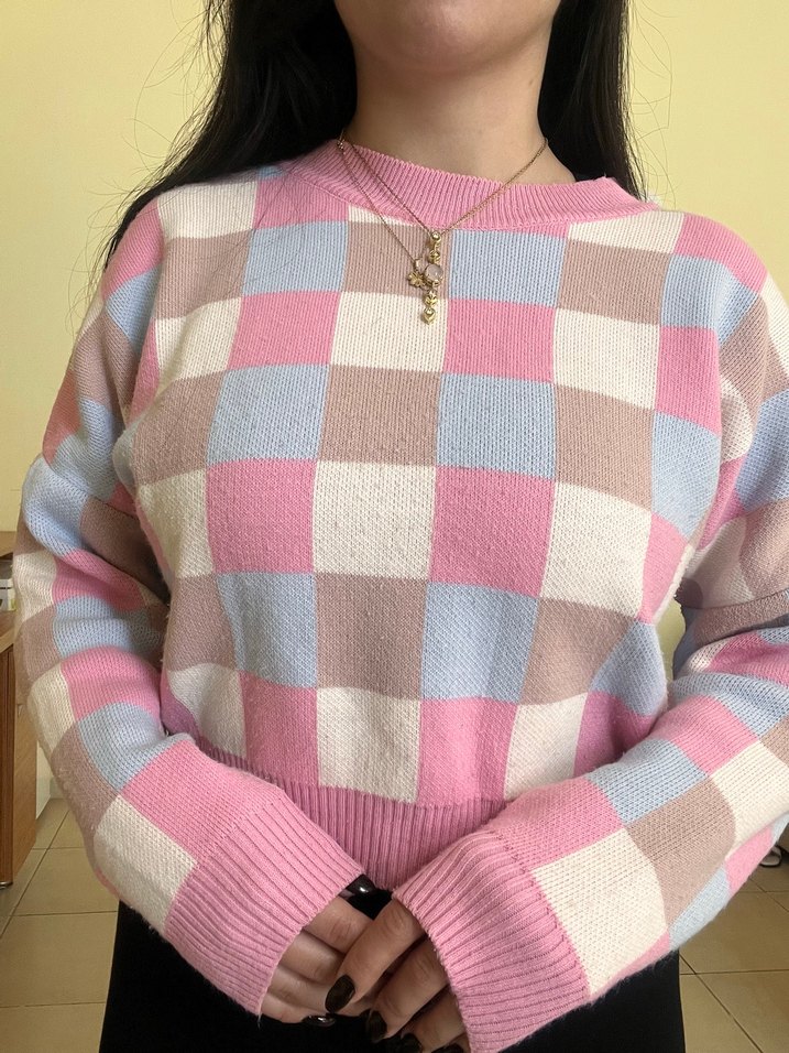 Pembe kareli desenli, yuvarlak yaka ve uzun kollu triko kadın kazak. Bol kesim ve normal boyda, rahat günlük sokak stili için uygundur.
