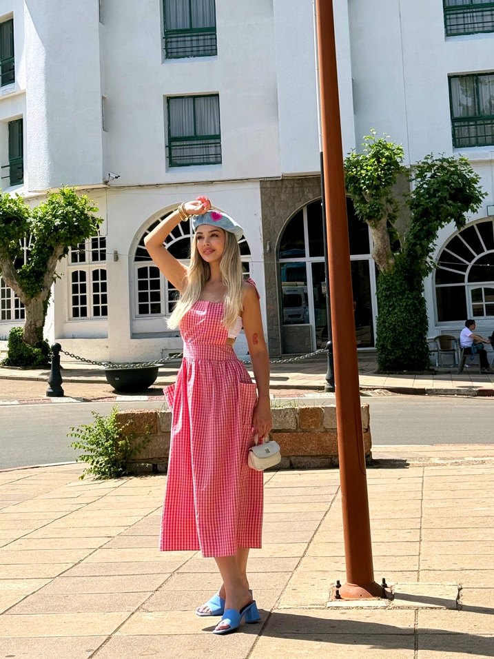 Pembe pastel kareli uzun elbise, askılı ve drapeli detaylara sahiptir. Yumuşak pamuktan yapılmış, rahat kesimli ve sokak stili için uygundur.