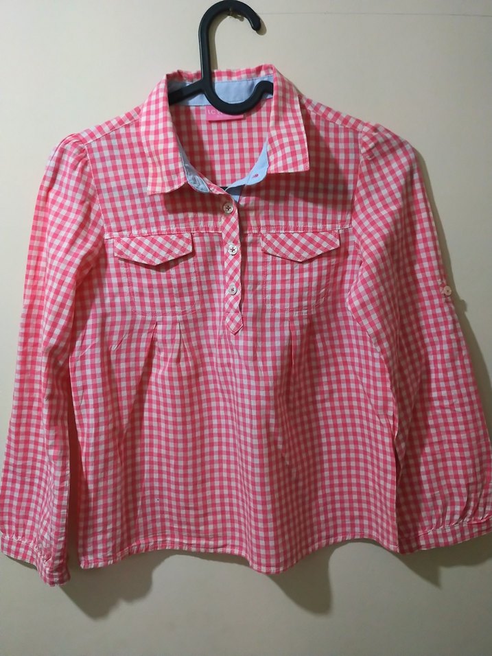 Pembe kareli, yakalı ve düğmeli uzun kollu kadın gömleği. Pamuklu, bol kesim, günlük rahat kullanıma uygun.