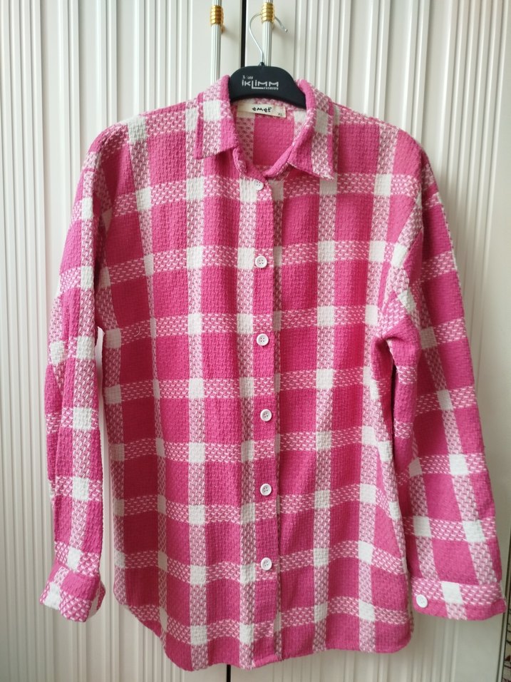Yumuşak pamuktan yapılmış, düğmeli, uzun kollu, gevşek kesim gömlek. Pastel pembe kareli desene ve çentikli yaka detayına sahiptir. Rahat ve gündelik kullanıma uygundur.