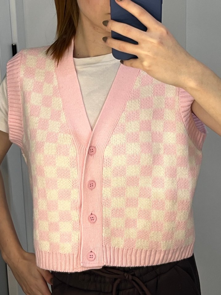Pastel pembe kareli örgü süveter, V yaka ve bol kesim ile casual sokak stiline uygun. Kolsuz ve düğmeli, rahat ve şık bir görünüm sunar. Boy 50 cm en 50 cm