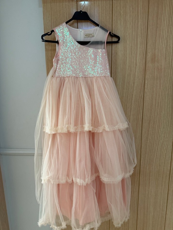 Pembe, askısız, kat kat fırfırlı ve bol kesimli kız çocuk elbisesi. Straplez yakaya ve hafif desenlere sahip, yumuşak sentetik kumaştan üretilmiştir. Sadece 2 kez kullanıldı,herhangi bir defosu yoktur,tertemizdir,kızım büyüdüğü için elden çıkarmak istiyorum