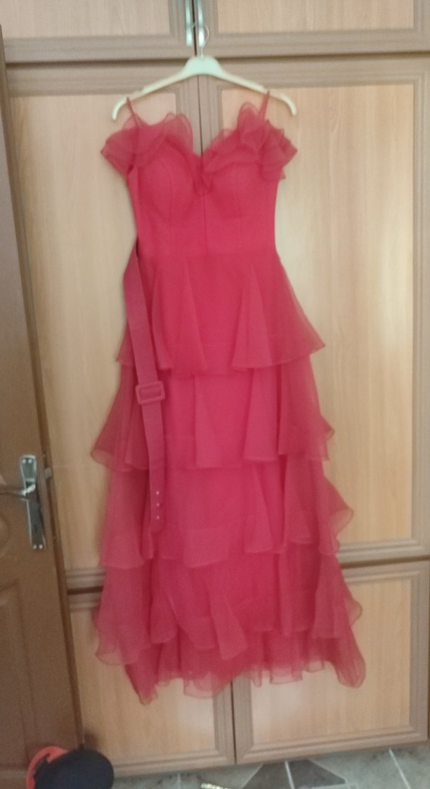 Pembe, uzun, kat kat volanlı, straplez ve ince askılı abiye elbise. Vintage bohem tarzı ve klasik zarafetiyle düğünler için uygun.SATİLDİ