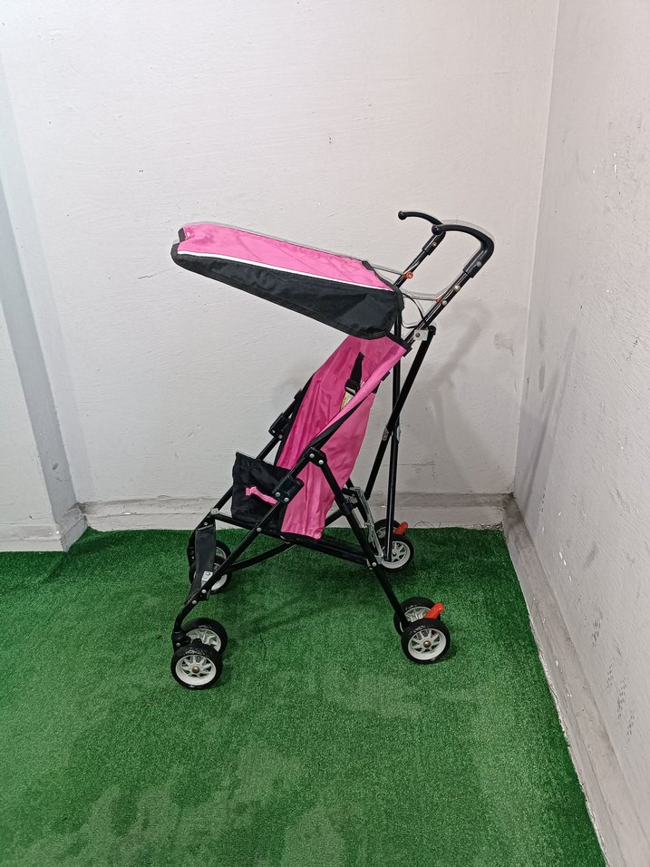 Katlanabilir iskelet ve renkli pembe kumaş tenteye sahip bebek arabası. Dört küçük tekerlekli, kompakt ve kolay kullanımlı. Hiçbir sorun sıkıntısı yok tertemiz sağlamdır alabilirsiniz bende birsürü bebek arabası var sayfama bakabilirsiniz