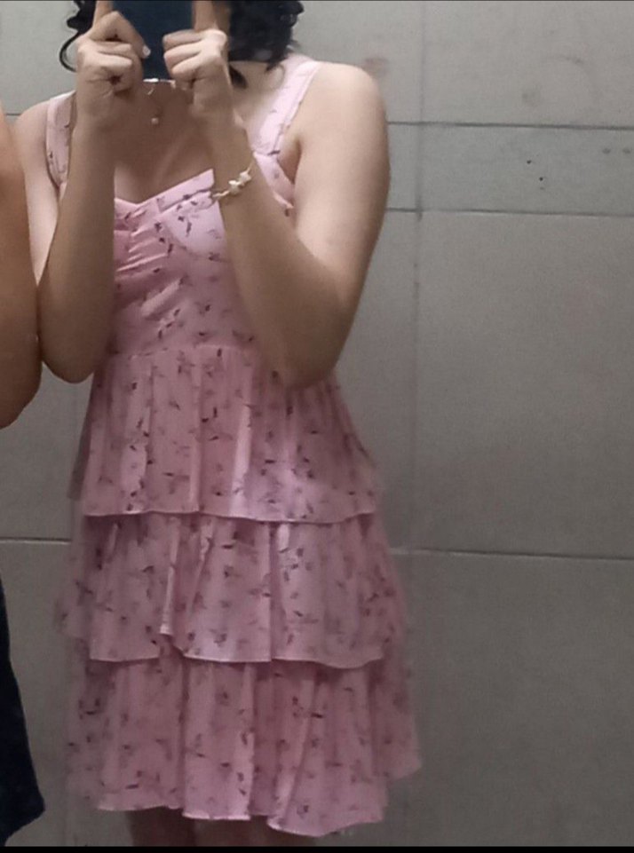 1 kere giyildi ben 700e almıştım 3 yıl önce pazarlık da yapılabilir tabi Pembe, ince askılı ve straplez yakalı, kat kat volan detaylı, sentetik kumaştan yapılmış, pastel tonlarda tie-dye desenli, vücuda oturan midi elbise. Koton Aslıhan Malbora collection