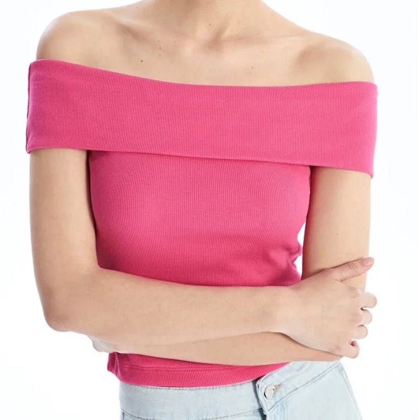 Pembe kayık yaka ve straplez kollara sahip, sentetik kumaştan yapılmış, vücuda oturan kadın bluzu. Günlük kullanıma uygun, çağdaş ve zahmetsiz şıklık sunar.