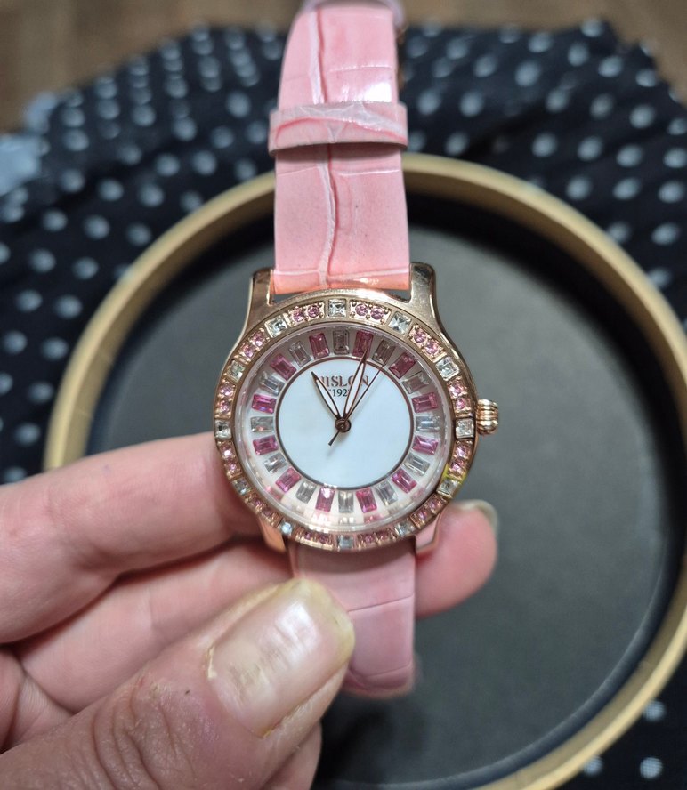 Hislon marka Pembe renkli, tokalı kayışı ve pembe ile şeffaf taşlarla süslü gösterişli kadranı olan kadın kol saati. Klasik zarafet ve rock punk tarzını yansıtıyor. ⌚sadece 2 kez taktım.