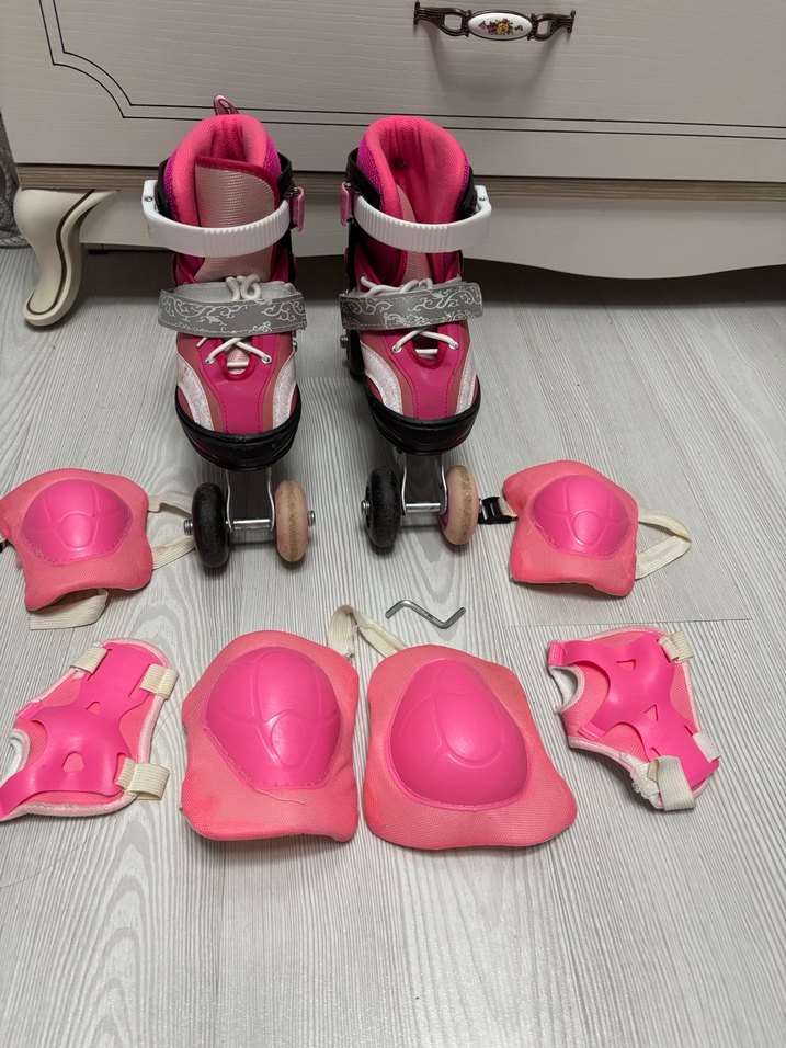 Pembe kaykay pateni, cırt cırtlı bantlıdır. Diz, dirsek ve bilek koruyucuları ile birlikte gelir. 34-37 numara