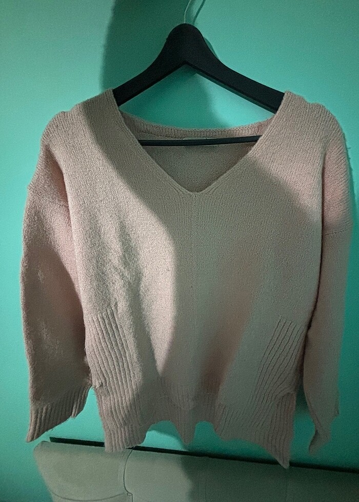 Pembe kazak, çok hafif tüylenmeler var. Rengi fotoğraftakinden bir tık daha pembe. Tatlı bir pembe tonu var. Geniş kalıp. Bol seven s/m bedene de olur. L bedene de