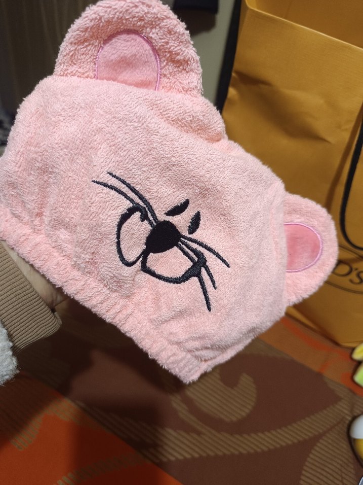 Pembe renkte, kedi yüzü nakışlı yumuşak kumaştan yapılmış, kulak detaylı havlu. saç kurutma şapkası ,5/6 yaş için uygundur