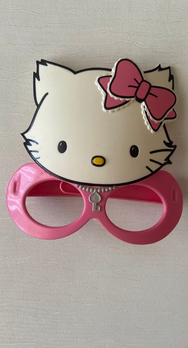 Pastel pembe renkte, fiyonk detaylı sevimli kedi figürlü kedi aksesuarıdır. Gözlük şeklinde