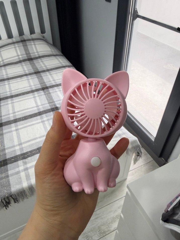 Pastel pembe renkte, kedi şeklinde masaüstü vantilatör, tek tuşla kolay kullanım sağlar.