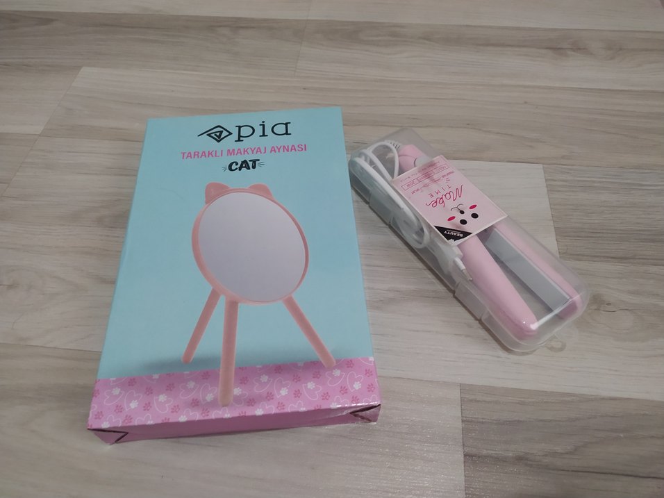 Pastel pembe renkte, kedi figürlü ve üç ayaklı makyaj aynasıdır. İçinde tarak bulunur ve sevimli bir görünüm sağlar.