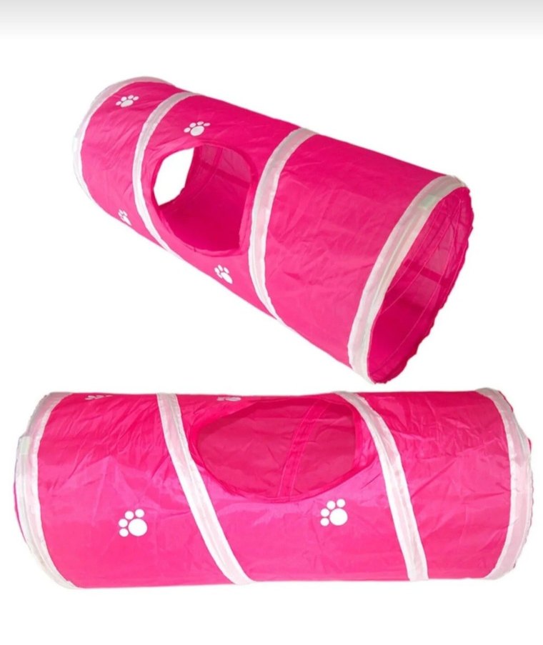 Renkli pembe kedi tüneli, yumuşak kumaş ve pati desenleriyle kedilerin oyun oynaması ve saklanması için alan sağlar. son fiyattır