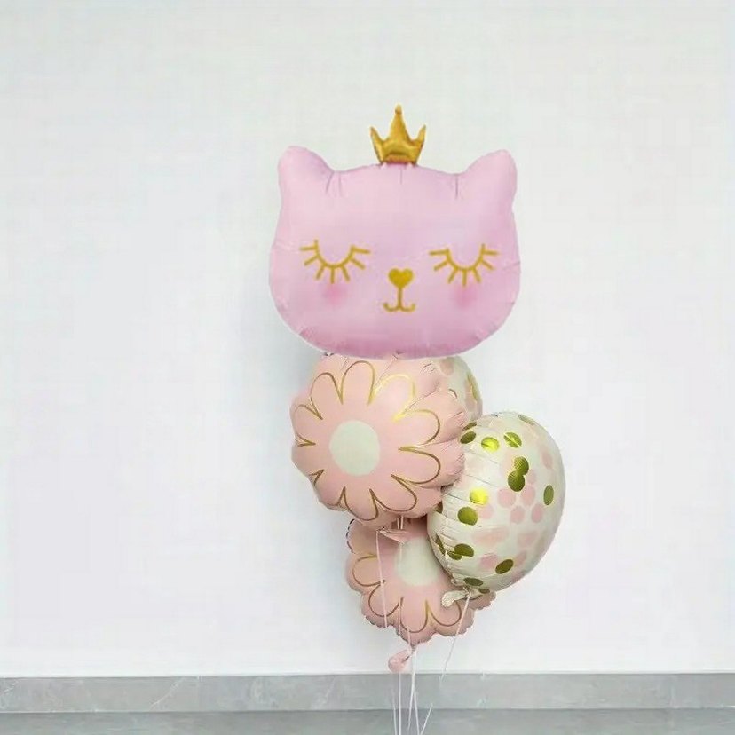 Altın taçlı kedi yüzü ve çiçek desenli pastel pembe parti balonları, kutlamalar için uygun .