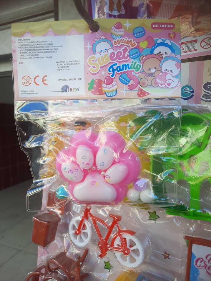Renkli pembe kedi pençe şekilli squishy, yumuşak dokulu Sweet Family koleksiyonundan oyuncak.