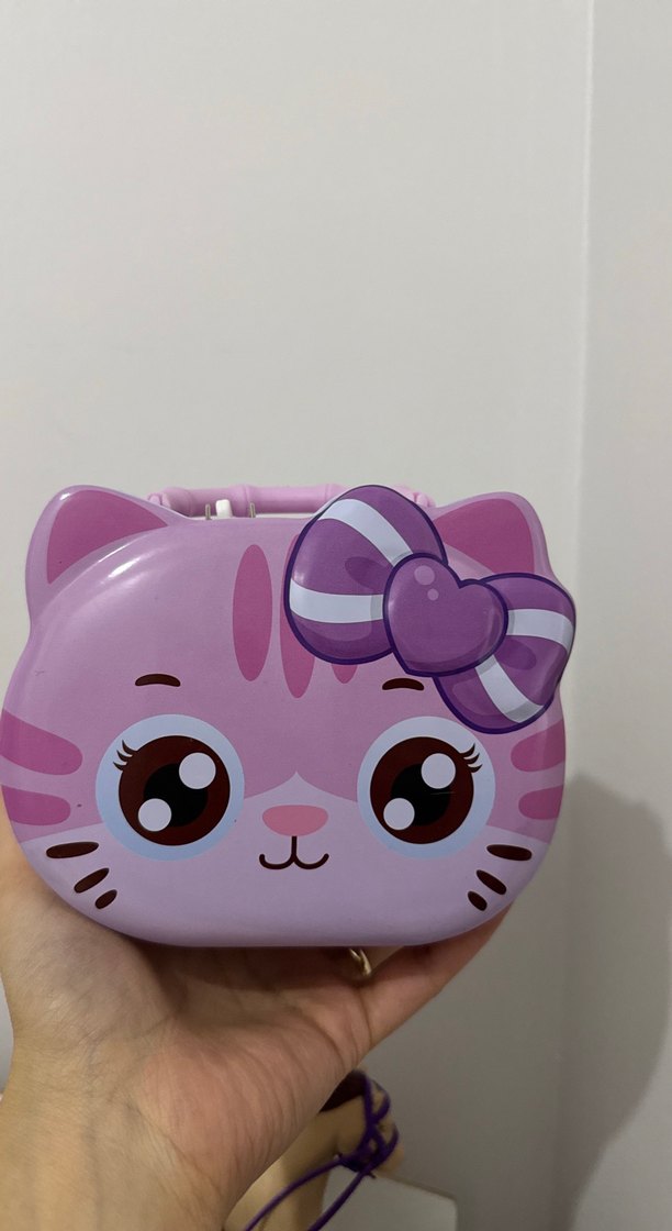 Pastel pembe renkte, kulakta fiyonk detaylı kedi şekilli küçük saklama kutusu.
