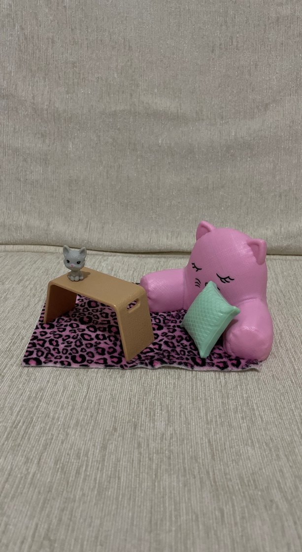 Pastel pembe kedi figürlü mini oyun seti; kedi şeklinde koltuk, küçük masa, yastık ve oyuncak kedi figürü içerir.