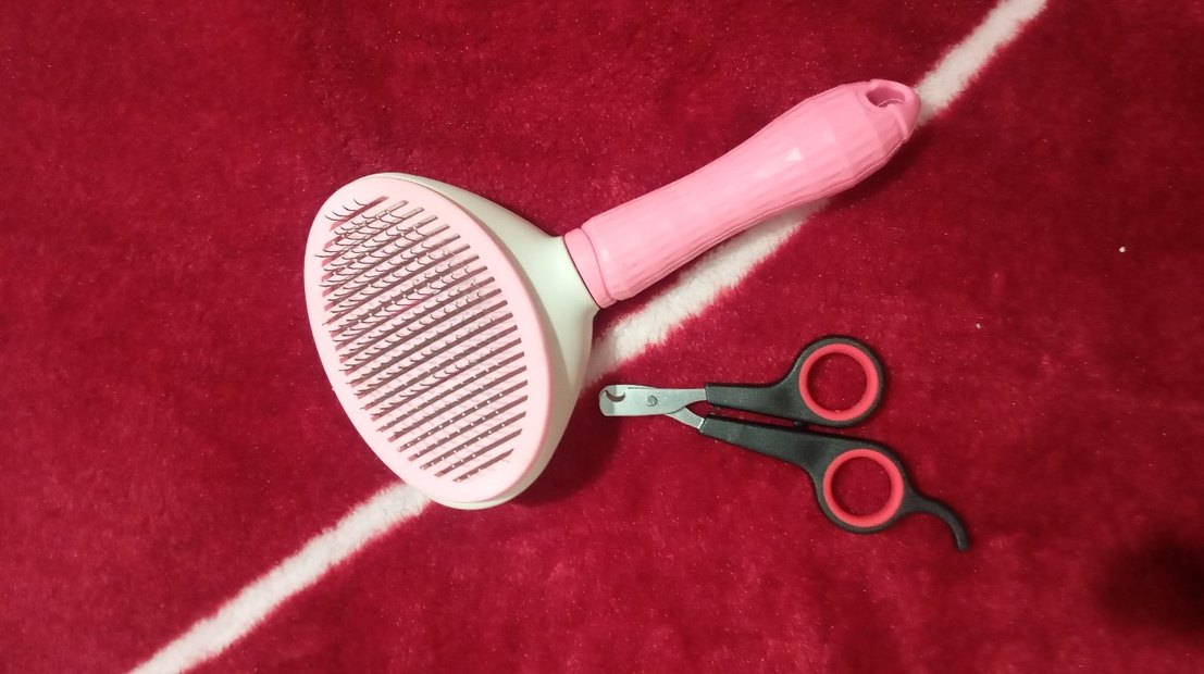 Pembe renkte kedi tüy tarağı ve tırnak makası içeren bakım seti.