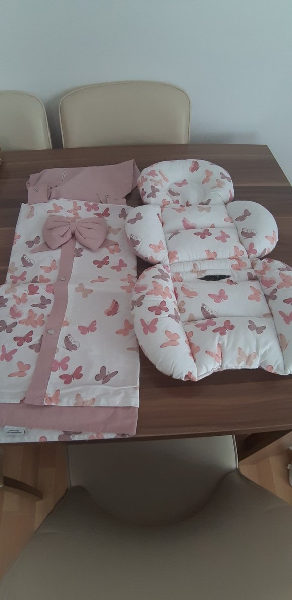 Pastel pembe renkte, kelebek desenli, yumuşak sentetik kumaştan yapılmış bebek uyku minderi ve örtüsü seti.
