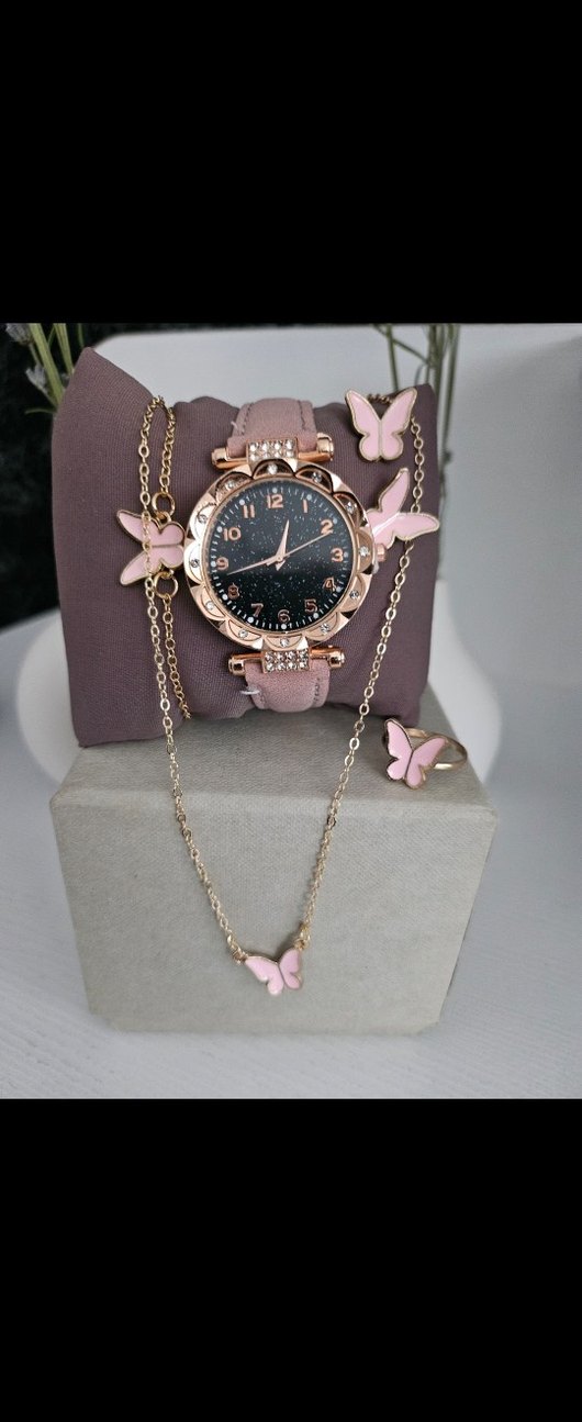Pembe kayışlı, simli detaylara ve kelebek figürüne sahip kadın saati. Kelebekli küpe, kolye ve bileklikten oluşan uyumlu takı seti ile birlikte gelir.