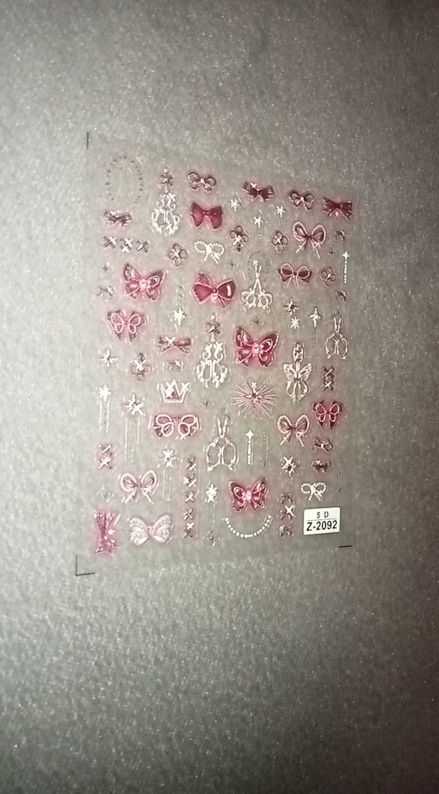 Pembe kelebek ve fiyonk desenli, gri detaylı tırnak süslemeleri. Şeffaf taban üzerinde farklı küçük tasarımlar içerir.
