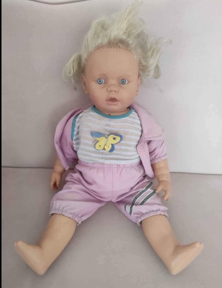 Pastel pembe renkte kelebek baskılı tişört, pantolon ve ceket giymiş bebek oyuncak. Açık renk saçları ve mavi gözleri var.