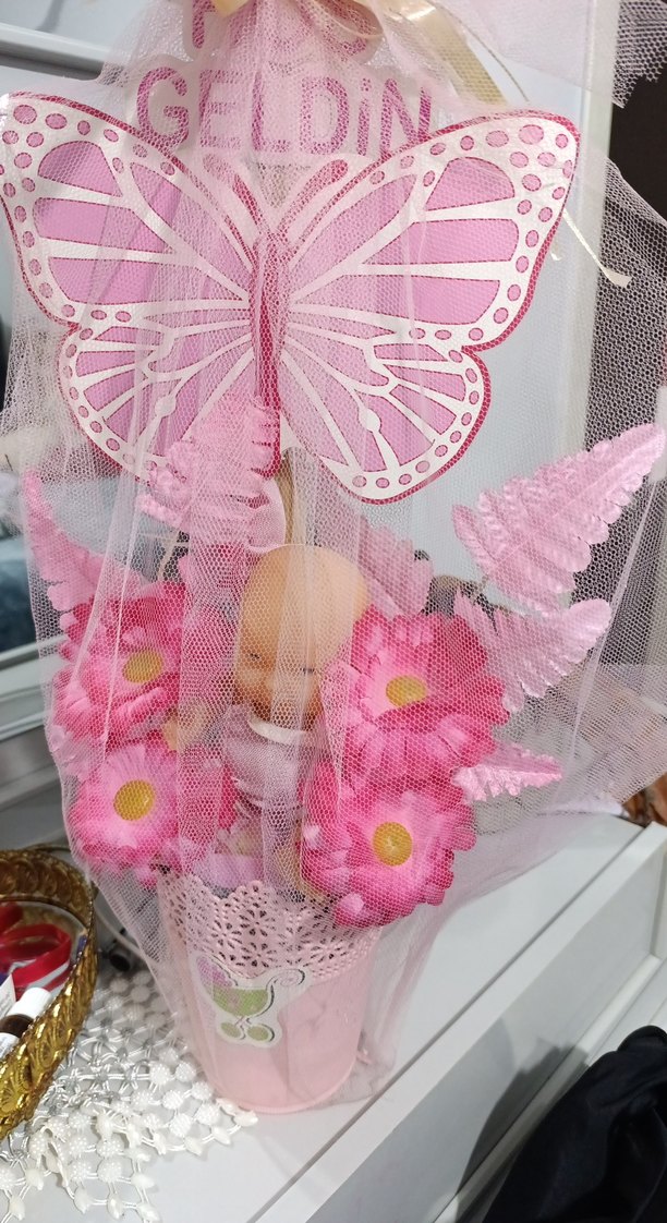 Pastel pembe çiçekler, küçük bir bebek ve kelebek süsü içeren, yumuşak tül ile sarılmış aranjman.
