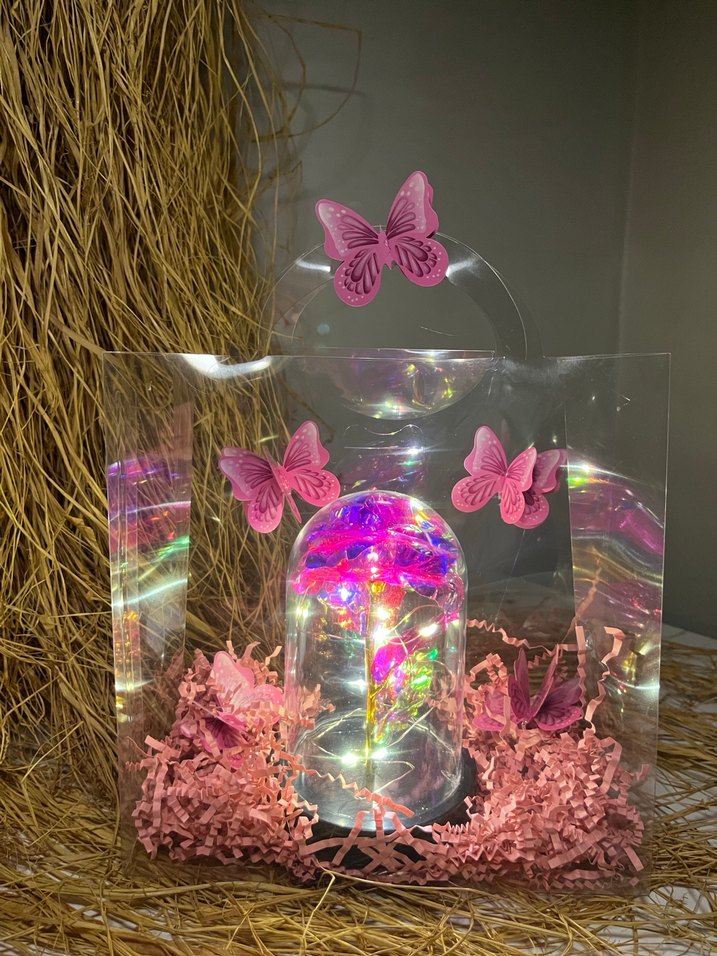 Pembe kelebek detaylı, renkli LED ışıklarla süslenmiş dekoratif ışıklı küre. Altında pembe kağıt parçaları bulunur.