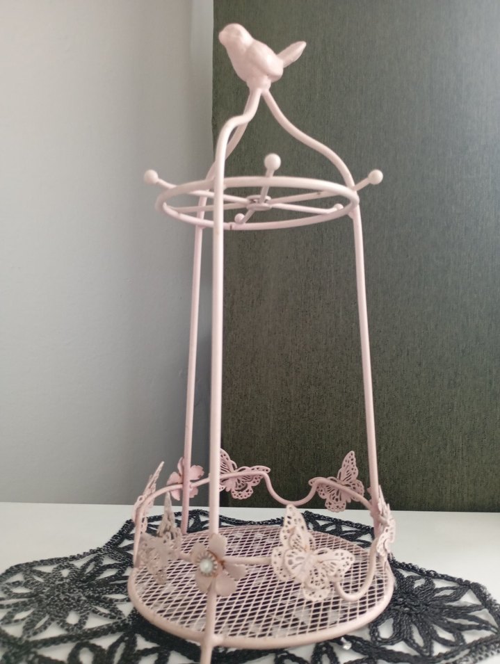 Pastel pembe renkte, kelebek ve çiçek detaylı dekoratif sepet. Üzerinde kuş figürü bulunur ve ince, hafif tasarıma sahiptir.
