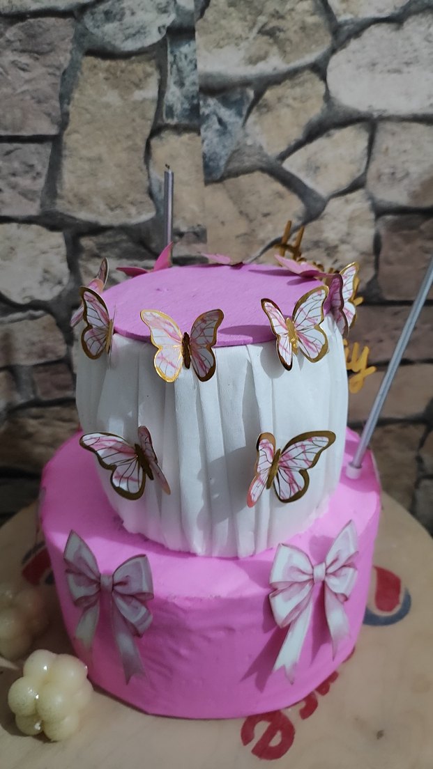 Açık pembe parti pastası süsü, beyaz kurdeleler ve kelebek detayları içerir.