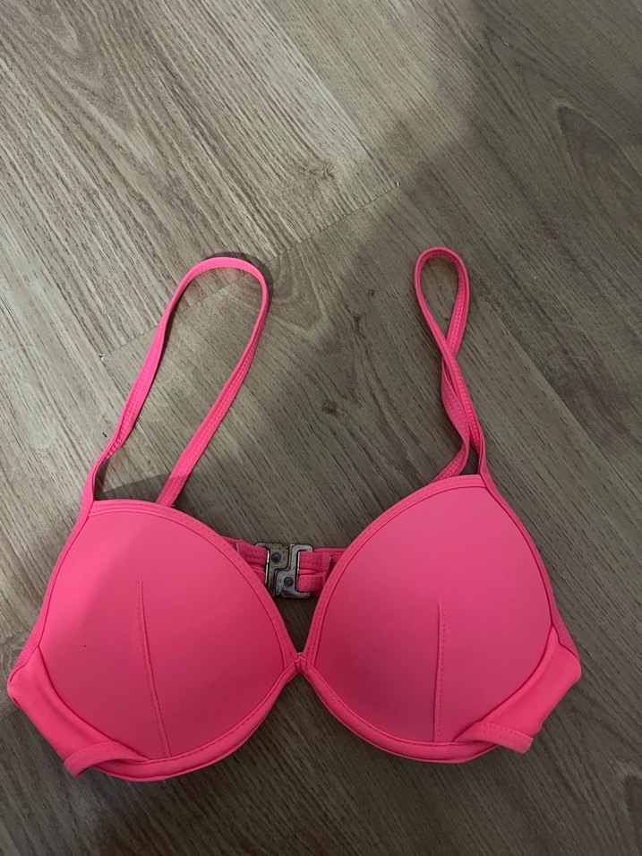 Pembe renkli, kemer tokalı ve askılı, vücuda oturan bikini üstü, cesur bir plaj görünümü sunar.