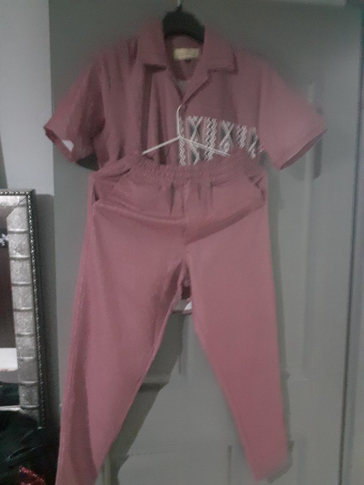 Pembe pastel tonlarda, kısa kollu, kemerli ve yakalı erkek midi pijama takımı. Salaş kesimi ve desen içermeyen tasarımıyla rahat athleisure stil sunar.