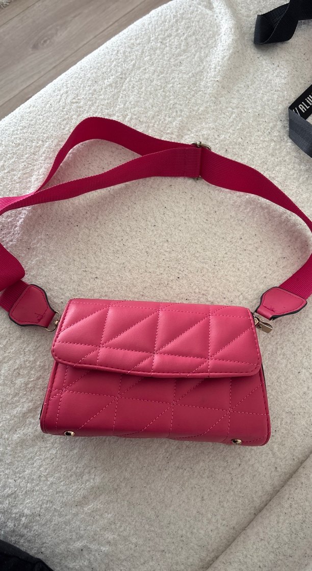 Pembe renkte, kemerli ve kapitone desenli kadın çantası. Geniş askısı ile renkli, desen içermeyen, trend sokak stili için uygun bir modeldir.