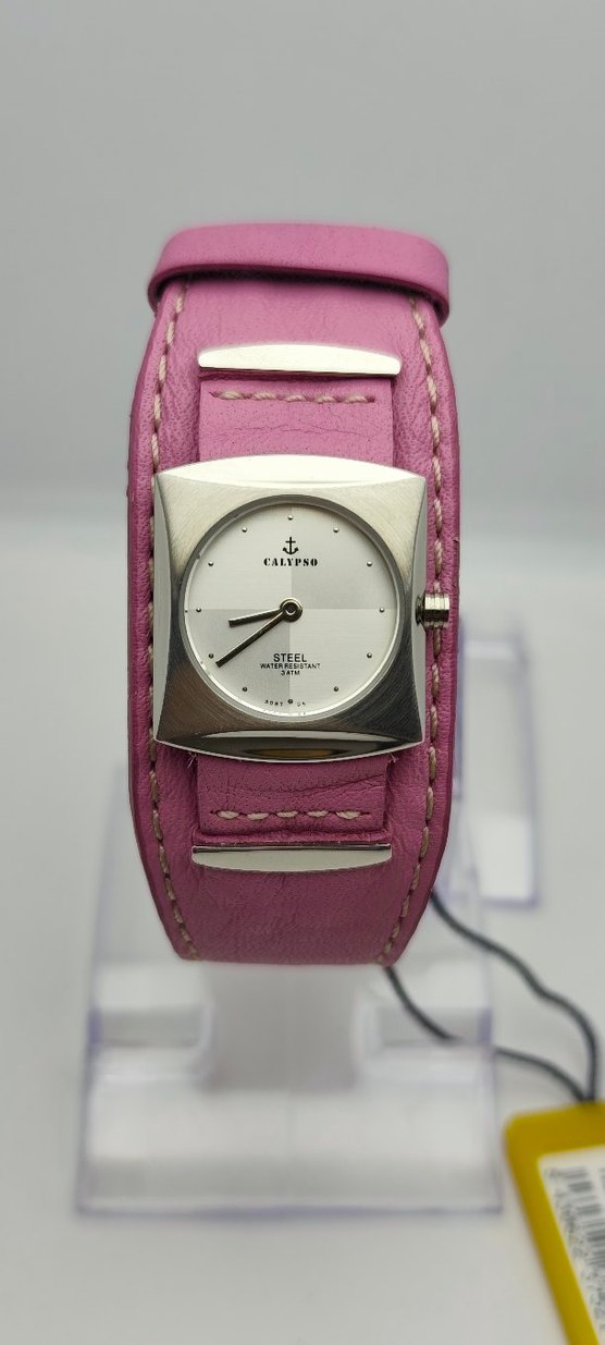 Calypso markalı pembe kemerli kayışa sahip kadın kol saati, kare gümüş kasa ve sade beyaz kadran içerir. Suya dayanıklıdır. ⌚