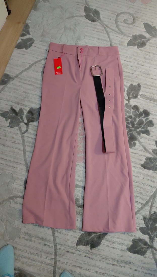 Pembe renkte, kemerli, midi boy, regular fit kadın kumaş pantolon. Düz desensiz, sentetik kumaştan, günlük rahat sokak stili için uygundur.