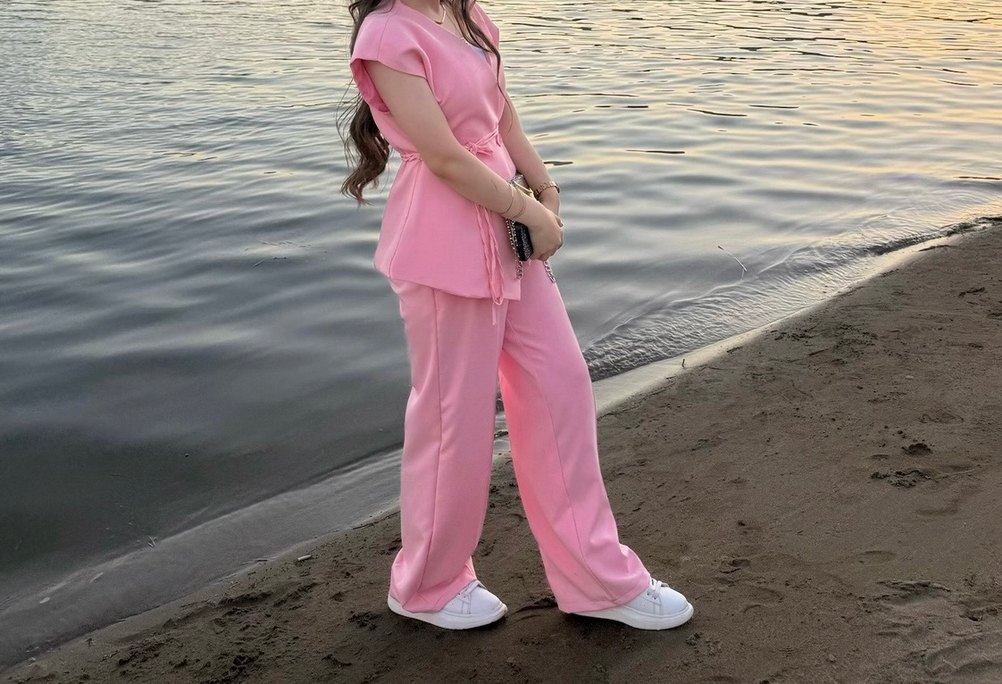 Sadece bir kere giyildi Pembe pastel renkli, kısa kollu ve V yakalı, kemerli salaş kadın takımı. Midi boy ve yumuşak sentetik kumaştan, günlük dış mekan kullanımı için uygun.