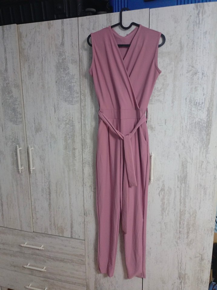 Pembe pastel renkte, kemerli, v yakalı, kolsuz ve sade tasarımlı, kadınlar için uzun ve vücuda oturan tulum. Günlük kullanıma uygun. Cepleri mevcuttur. S-M beden için uygundur.