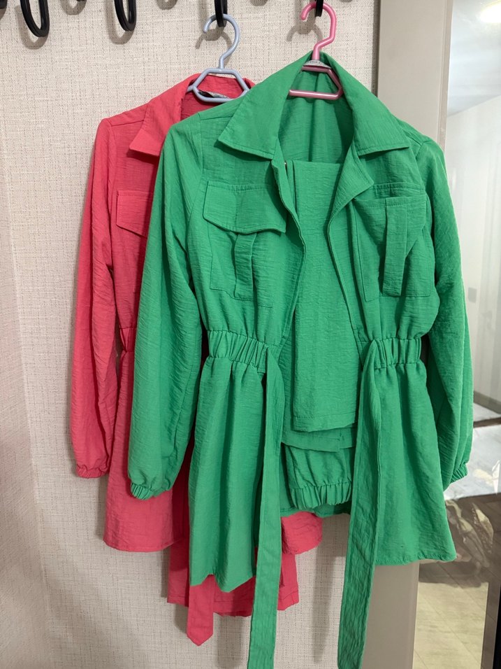 Pembe keten kumaştan yapılmış, kemerli, kısa kesim, notched lapel yakalı, uzun kollu kadın takımı. Günlük kullanıma uygun sade ve pastel tonlarda tasarlanmıştır. 2 rengi mevcuttur tek takım fiyatıdır