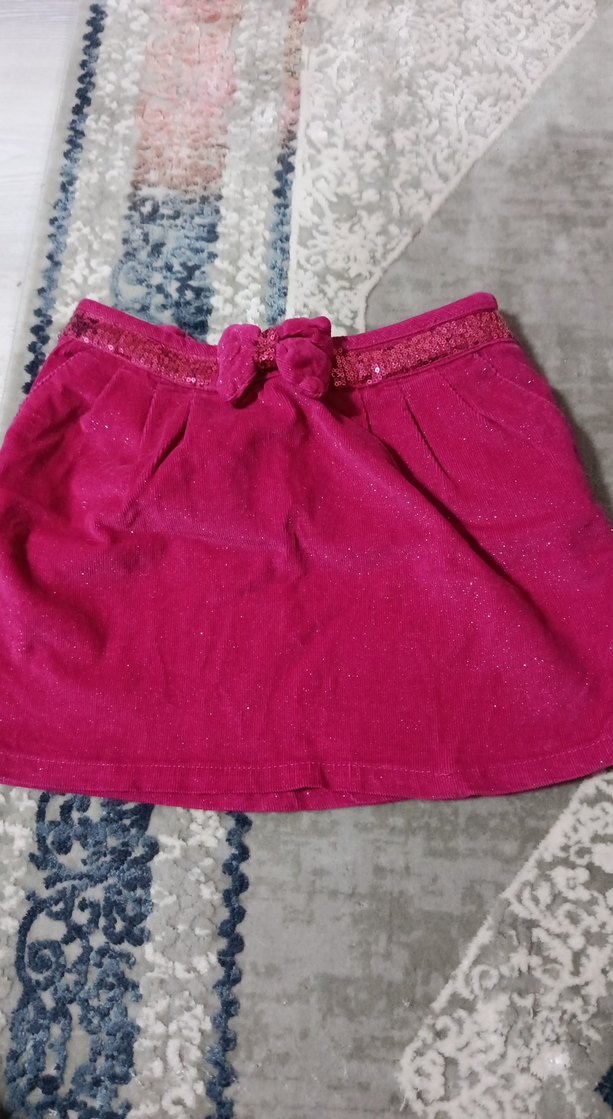 Renkli pembe polar kumaştan, kemerli ve bol kesim kız çocuk eteği. Desensiz ve yumuşak dokulu.