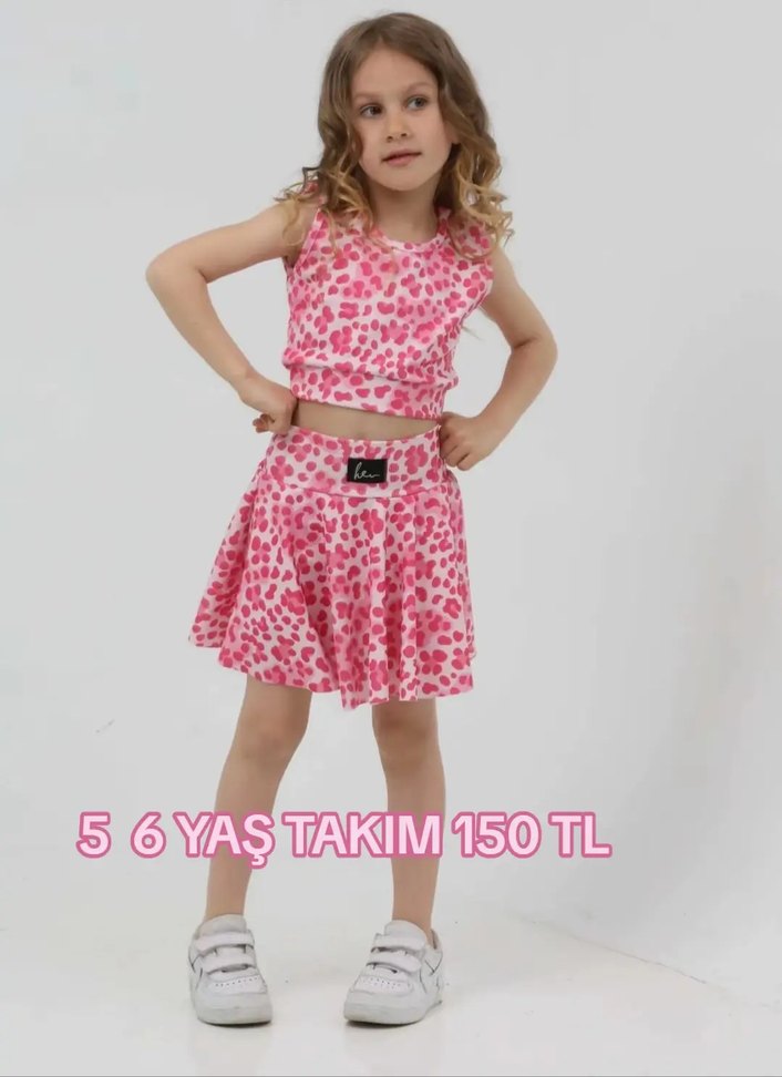Kemerli, askısız yaka, bol kesim pembe kız çocuk takımı. Sentetik kumaştan, bağlama desenli, sokak modasına uygun.