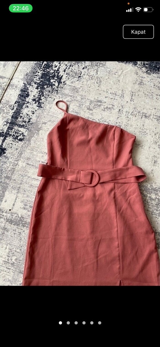 toz pembe renkte, kemerli ve askılı midi elbise. Tek renk, tekne yaka ve yumuşak sentetik kumaştan üretilmiştir. Romantik buluşmalar için uygun.