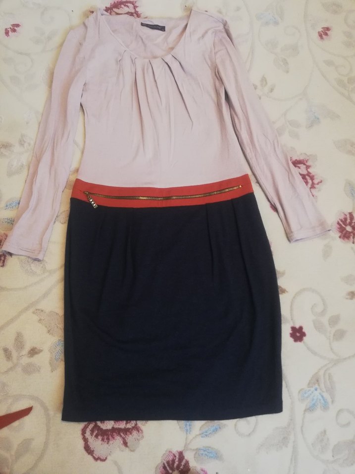 Pembe kemerli, normal midi boyda, sentetik kumaştan yapılmış dar kesim elbise. . Ofis ve bohem tarzlar için uygun. Sadece kırışık. En 40, Boy 91 cm