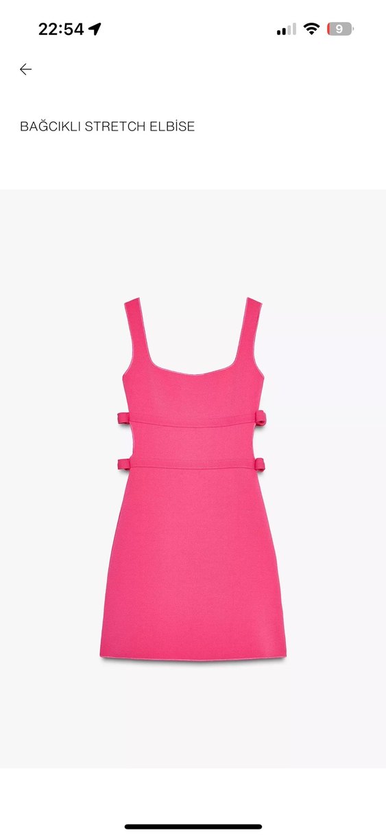 Pembe, kemerli ve dar kesim mini elbise, geniş askılarla ve düz dokulu sentetik kumaştan üretilmiştir. Minimalist tarzda, romantik akşamlar için uygundur.