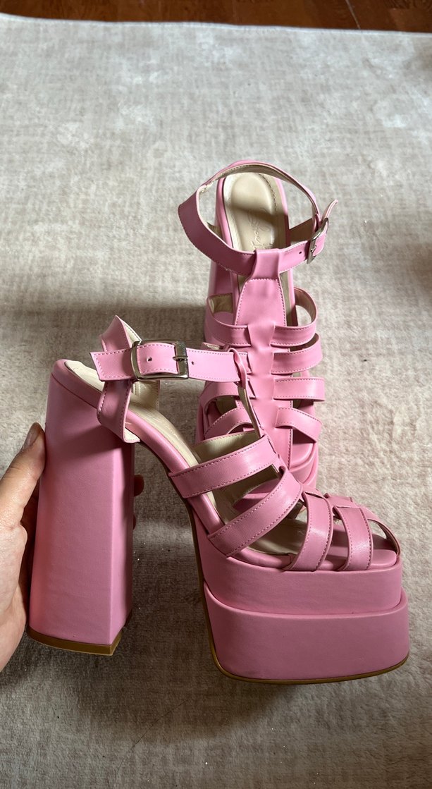 Pastel pembe renkte, kemerli ve kare desenli platform topuklu kadın ayakkabısı. Kauçuk malzemeden, cesur ve gotik tarzda, parti için uygun.