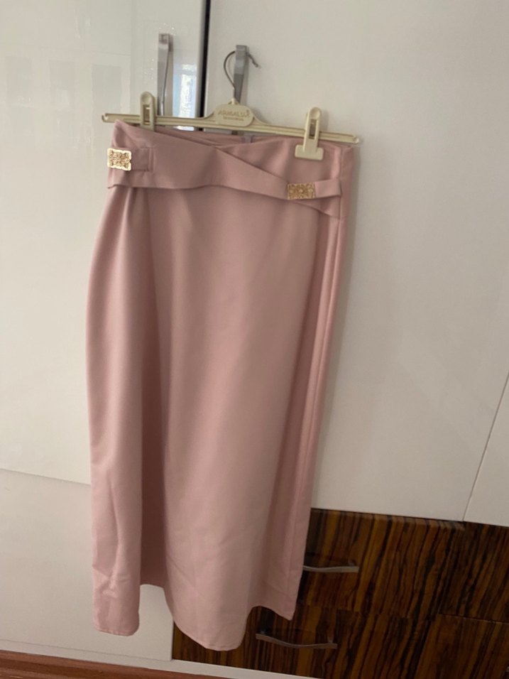 Pembe renkte, kemerli ve düz desenli uzun kadın eteği. Sentetik kumaştan, rahat kesimli ve ofis için uygun klasik şıklıkta.