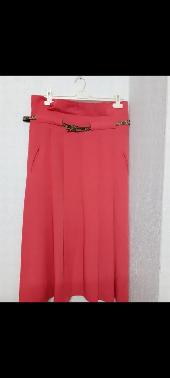 Parlak pembe renkte, kemerli ve leopar desenli detaylı uzun kadın eteği, ofis ve günlük kullanıma uygun rahat kesimdedir.