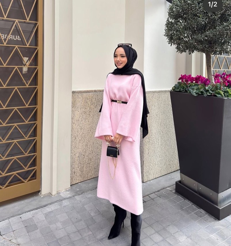Pembe Kemerli Uzun Kollu Uzun Elbise